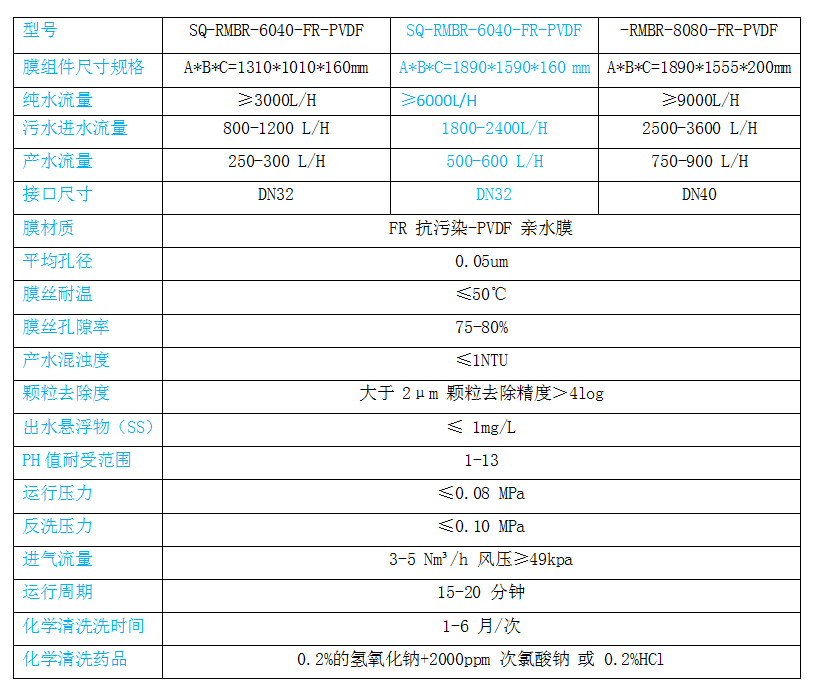 注:1、對于不同的水質,其產水量會有較大區別,用戶應進行充分試驗,本表參數是處理生活/市政污水時數據。